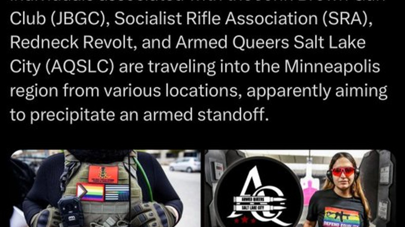 ANTIFA organizations in multiple states have gone to full mobilization status, and individuals associated with the John Brown Gun Club (JBGC), Socialist Rifle Association (SRA), Redneck Revolt, and Armed Queers Salt Lake City (AQSLC) are traveling into the Minneapolis region from various locations, apparently aiming to precipitate an armed standoff.