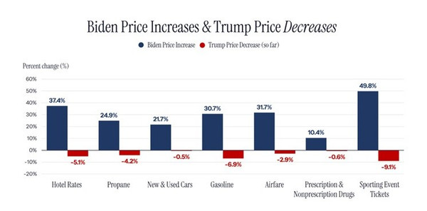 Democrats caused it. Under Biden, prices rose across the board; for example, car prices rose 22%, gas prices rose 30%, hotel rates rose 37%, and airfares rose 31%.